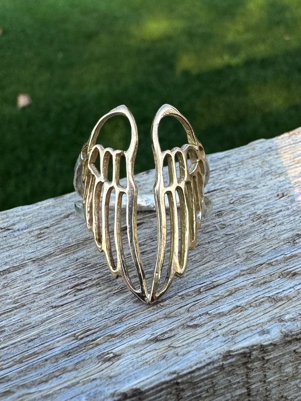 2 large 10k gold handmade wings sits on an open sterling silver ring band.